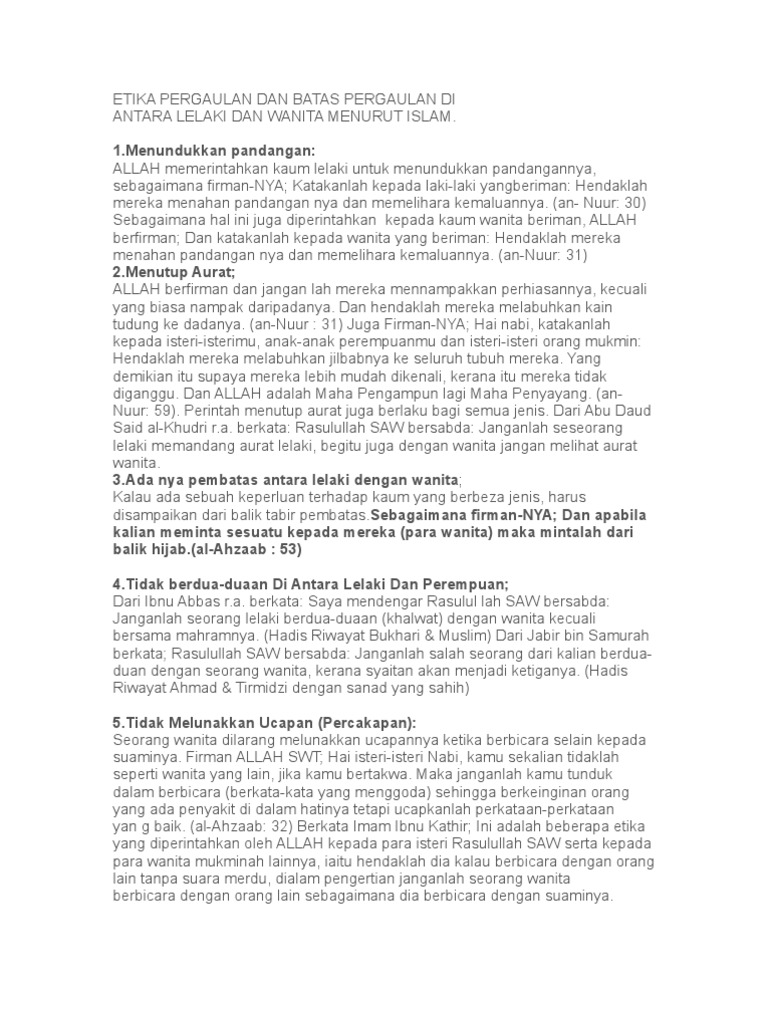 Batas pergaulan lelaki dan wanita 36 menjaga pandangan 43 adat pertuturan 46 kiodata penulis 47. Pemakaian menutup aurat bagi lelaki dan perempuan. Pergaulan disebabkan urusan jual beli: 2) mengekalkan adab dan batas pergaulan antara lelaki dan perempuan menurut aspek sosio budaya dan agama. Maksud pergaulan (ikhtilat) dalam perbincangan ini ialah bergaul atau bercampur di antara lelaki dan perempuan ajnabi (yang sah kahwin) di satu tempat yakni berlaku.