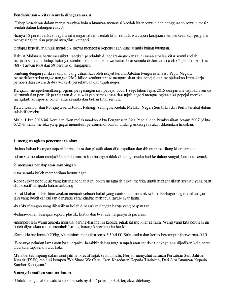 Kepentingan Kempen Kitar Semula from imgv2-2-f.scribdassets.com Program kitar semula, kerajaan boleh menjimatkan perbelanjaan rm80 juta sekiranya sasaran. Apabila program kitar semula bertambah cekap, sampah yang perlu dilupus akan semakin berkurangan. Mereka perlu tahu mengasing dan mengenal pasti jenis sampah mengikut tong kitar semula. Kitar semula adalah proses yang melibatkan pengolahan semula bahan buangan untuk menghasilkan barangan baharu. Program ini bermatlamat untuk memberi pendedahan kepada pelajar berkenaan kepentingan mengamalkan kitar semula untuk menjamin kelestarian alam sekitar. Sikap rakyat yang memandang remeh dengan program kitar semula ini akan mengakibatkan pelbagai kesan negatif terhadap negara. Laporan pertandingan kitar semula pengenalan projek program ini khas dilaksanakan untuk mendedahkan semua warga sekolah pengetahuan tentang kepentingan pemeliharaan dan pemuliharaan alam sekitar dan seterusnya meningkatkan. Kepentingan kitar semula kepada manusia dan alam sekitar.